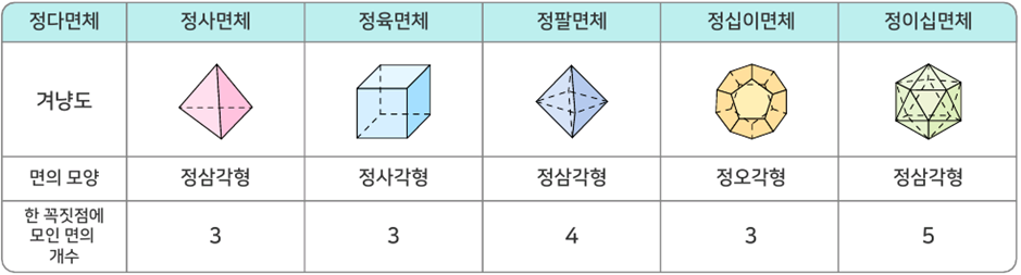 한 꼭짓점에서 3개이상의 면이 만나야 하기 때문이고 한 꼭짓점에 모이는 다각형의 각의 크기의 합은 360˚보다 작아야 합니다