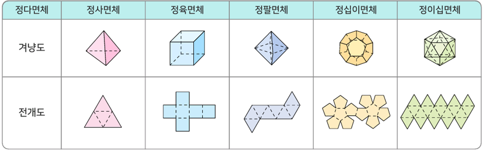 2) 정다면체는 정사면체, 정육면체, 정팔면체, 정십이면체, 정이십면체 총 5가지 입니다.