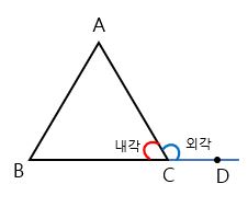 삼각형에서 한 외각의 크기는 그와 이웃하지 않는 두 내각의 크기의 합과 같습니다.