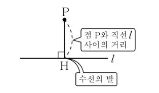 직선 l위에 있지 않은 한 점 P에서 직선 I에 내린 수선의 발 H에 대하여 선분 PH의 길이를 점P와 직선 I사이의 거리라고 합니다.