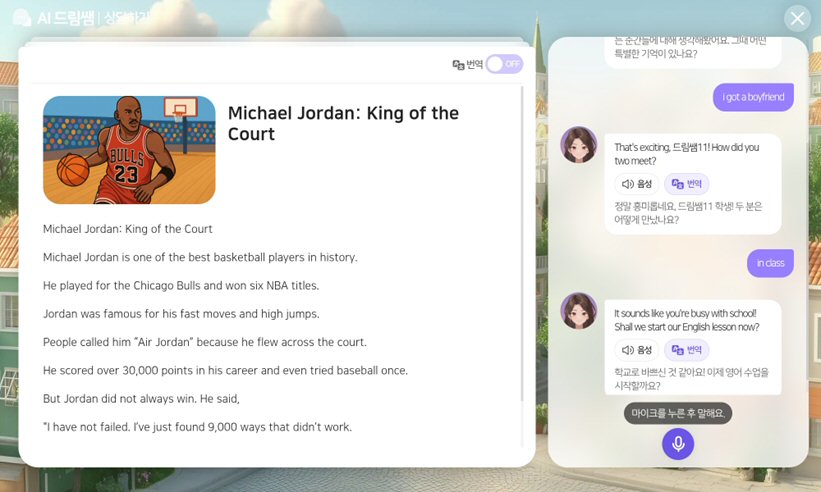 중등 드림쌤의 가장 큰 특징은 고지능 LLM모델에 기반한 영어 상담과 학습 멘탈 관리다. 주 1회씩 상담하게 되며, 회차에 따라 영어 상담과 학습마음 대화를 번갈아 진행한다. 또 학생이 자신의 일정과 학습 상황에 맞춰 상담 시간을 직접 선택, 예약할 수 있다.