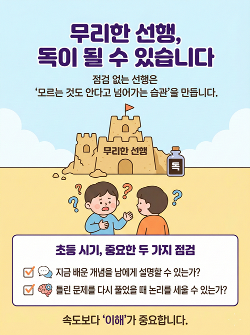선행 학습 자체가 나쁜 것은 아닙니다. 하지만 점검 없는 선행은 자칫 '모르는 것도 안다고 넘어가는 습관'을 만들 수 있습니다. 초등 시기에는 진도를 빼는 속도보다 내 것으로 만드는 이해가 훨씬 중요합니다.
