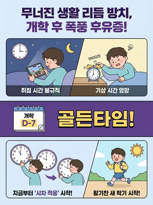 취침과 기상 시간. 많이 흐트러졌죠? 깨진 리듬을 되돌리는 데는 생각보다 많은 에너지가 소모됩니다. 오로지 공부에 집중할 수 있도록, 개학을 일주일 앞둔 지금이 생체리듬 회복의 골든타임입니다.